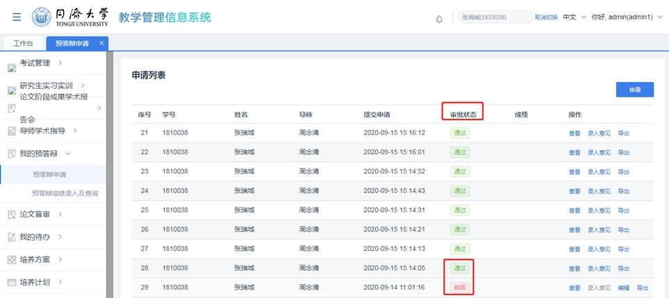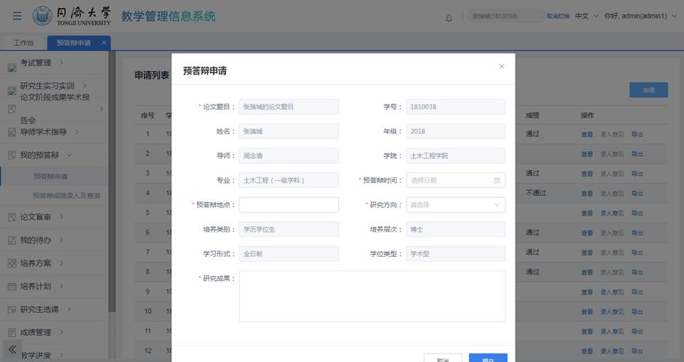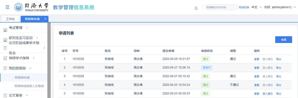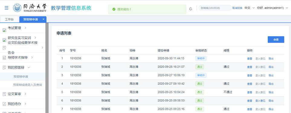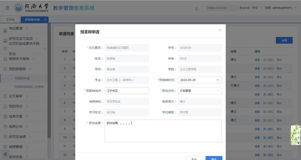 教学管理系统,进入“我的预答辩>预答辩申请”菜单;