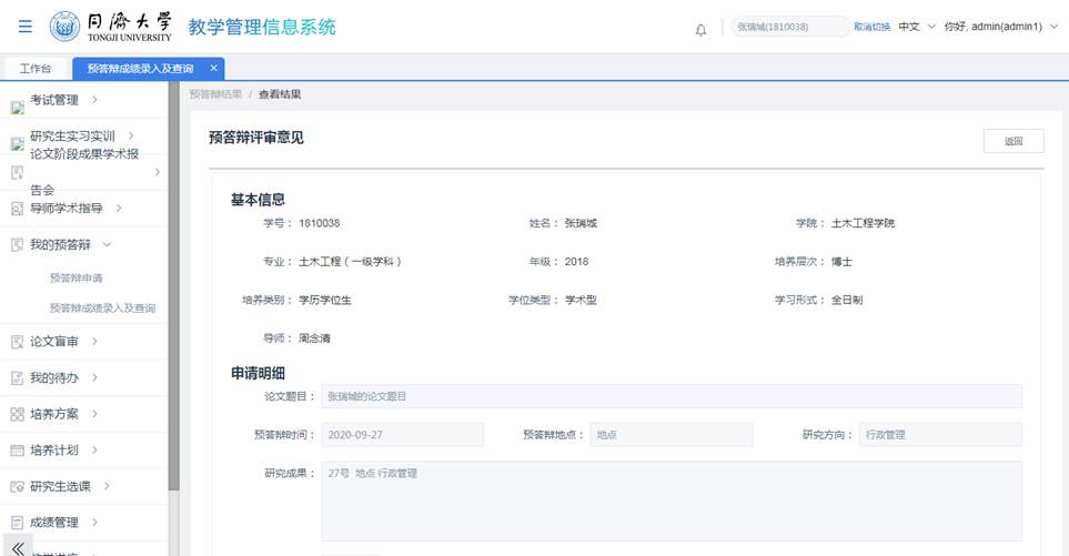 学生可以对预答辩结果进行查询操作。