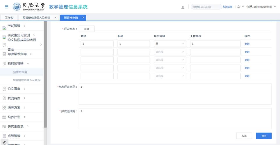 l 学生需要配置权限后才可看到“预答辩”菜单,如未看到菜单,请联系管理员为其授权后再重新登录查看。