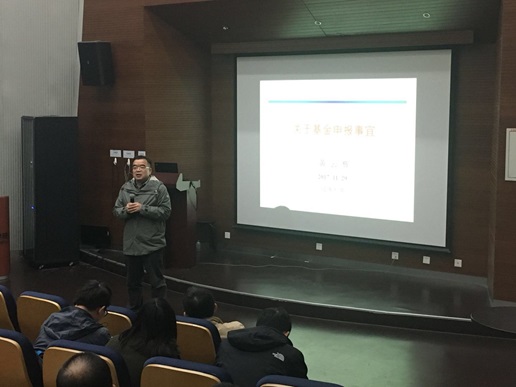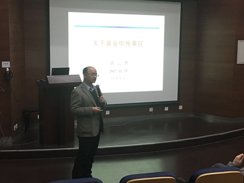 随后,黄云辉主任做了《关于基金申报事宜》的辅导报告,报告充分分析了学院近三年来国家自然科学基金申报及获批情况。黄云辉老师结合自己国家自然科学基金申请与评审体会,对项目申请书的选题、摘要、立项依据、研究内容、研究方案、技术路线、特色与创新、研究基础等方面进行了指导。为了让现场老师可以对申请书撰写有更直观的认识,他用自己的申请书做样本,详细讲解了申请书中各部分的撰写要点和注意事项。他特别强调了细节决定成败,要敢于把自己的申请书拿出来请大家提意见,多交流才会有进步。