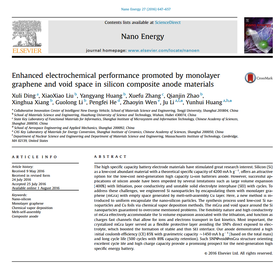 研究团队在纳米能源领域顶尖期刊《Nano Energy》(IF=11.55)上发表了题为《Enhanced Electrochemical performance promoted by monolayer graphene and void space in silicon composite anode materials》的文章。该论文的第一作者为该团队丁旭丽副研究员,通讯作者为黄云辉教授,色情视频