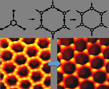 该论文首次在金属表面研究了端基炔溴基团的脱溴耦合反应,通过运用超高真空扫描隧道显微镜(UHV-STM)高分辨成像并结合密度泛函理论(DFT)计算,在原子尺度揭示了端基炔溴基团耦合反应的机制,并且通过合成了三种在不同对称位点接有炔溴基团的有机分子,成功在表面构建了具有炔基(即sp1杂化碳)骨架的二聚体、分子链以及二维网络结构。除此之外,通过端基炔溴基团耦合的反应,还构建了独特的炔-金属-炔型结构。此项成果进一步拓展了表面碳碳耦合反应,加深了人们对于碳卤化合物在表面化学反应过程的理解,并为高效制备具有炔基骨架的新颖纳米碳材料(如卡拜、石墨炔)提供了一种可能的路径。