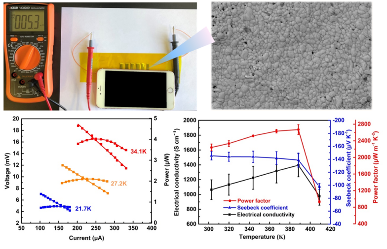 将复合膜组装成6个热电单臂柔性热电器件,在温差34.1 K时的最大功率密度高达37.6 W m-2。归一化的最大功率密度PDmax·l/ΔT2也高于已报道的柔性热电器件的值。将该6单臂器件放置于刚运行过游戏软件的手机下,手机温度与室温间9.4 K的温差下,该柔性热电器件产生了5.3 mV的电压。表明这种超高性能柔性热电薄膜在可穿戴设备中有潜在的应用。上述工作以 “Exceptionally high power factor Ag2Se/Se/polypyrrole composite films for flexible thermoelectric generators”为题发表于Advanced Functional Materials上。论文第一作者为色情视频