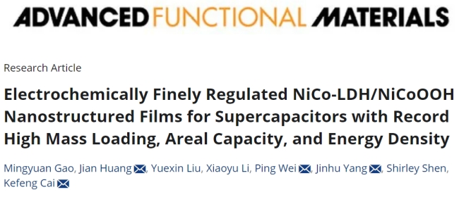 蔡克峰教授课题组及其合作者的研究论文“Electrochemically finely regulated NiCo-LDH/NiCoOOH nanostructured films for supercapacitors with record high mass loading, areal capacity, and energy density”。该研究通过简单的电化学沉积结合电化学活化成功得到了NiCo-LDH/NiCoOOH复合薄膜。该复合薄膜在超高负载量下展现出高的面积容量和稳定性。该论文采用了非原位电子顺磁共振波谱监测电化学活化过程中氧空位的变化,并结合理论计算揭示了电化学活性物质与电化学活化过程中的氧空位之间相互转化机理。此外,该电极材料的合成可以进一步实现数百毫克级负载量的批量化制备,揭示了其在实际电化学储能设备中应用的潜力。