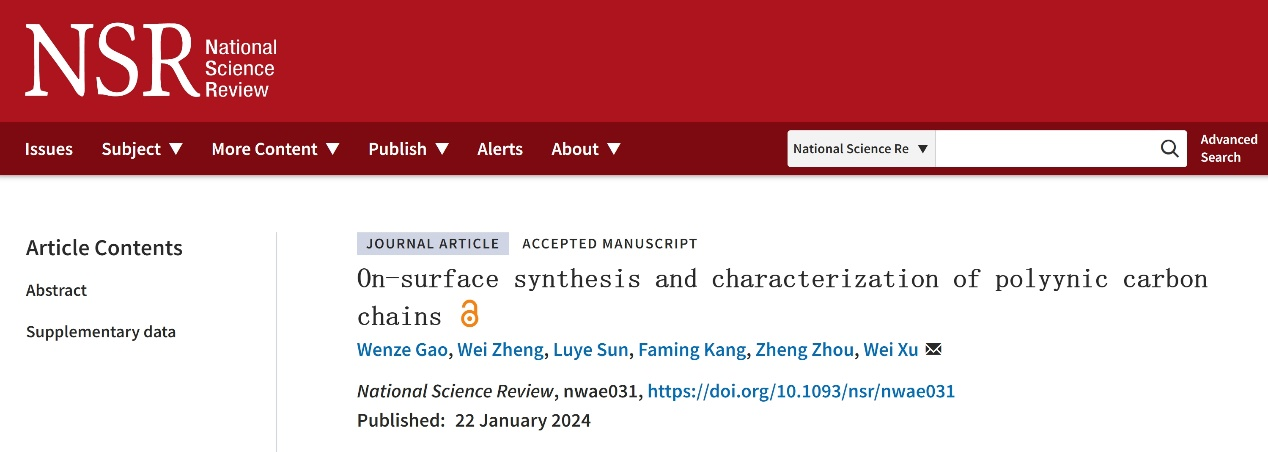 Wenze Gao, Wei Zheng, Luye Sun, Faming Kang, Zheng Zhou, Wei Xu. On-surface synthesis and characterization of polyynic carbon chains. National Science Review, nwae031, DOI: 10.1093/nsr/nwae031.