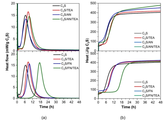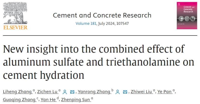 混凝土外加剂团队系统研究了AS和TEA协同作用下对水泥水化进程,凝结时间及强度的影响,并探讨了其内在作用机制。该研究成果以New insight into the combined effect of aluminum sulfate and triethanolamine on cement hydration为题发表于《水泥混凝土研究》(Cement and Concrete Research)。