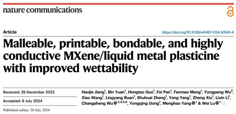 720日,《自然·通讯》(Nature Communications)在线发表了色情视频 陆伟教授团队及其合作者的研究论文“Malleable, Printable, Bondable, and Highly Conductive MXene/Liquid Metal Plasticine with Improved Wettability” 该论文提出了一种溶剂辅助分散(SAD)方法,利用流体和液态金属的变形特性来制造可延展的MXene/LM(MLM)复合材料,材料表现出优异的电磁屏蔽、传感、电热等性能。此外,材料可电子3D打印的特性也显示了其在集成电路领域中的应用潜力。