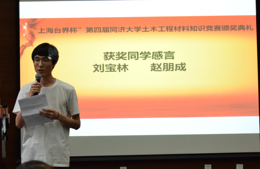 一等奖获得者刘宝林和赵朋成两位同学分别发表了获奖感言。他们均对竞赛主办方和协办方表示由衷感谢,认为土木工程材料系倡议发起的土木工程材料知识竞赛,对于在读大学生们来说,是每年热切期待的一项赛事,可以帮助同学们找到努力的方向,了解并深入学习一门专业知识并进行认真思考。赵朋成同学说:“参加这次比赛,有助于我们夯实专业基础,建立完善的知识体系,使我们在面临实际问题并想方设法解决问题的过程中加深对土木工程材料的认识。因此我特别感谢主办方和赞助方!”他还说:“当代青年要有激情和力量。一代人有一代人的使命,一代人有一代人的担当。中华民族站起来的近代史,是用血泪书写的斗争史;中华民族富起来的现代史,是用汗水书写的奋斗史。而我们这一代的使命是让我们的民族强起来,我想,我们的历史是用智慧书写的历史,因为这个时代的命门是科技。而不论在哪个历史时期,学生时代总是最富有激情、最富有创造力的时期。恰同学少年,风华正茂,望吾辈能求真学问,练真本领,心中有阳光,脚下有力量。”