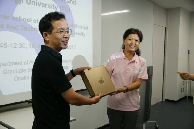 参观完毕后,团队返回会议室,王凌凌副书记代表交流团队向甲谷教授赠送纪念品。