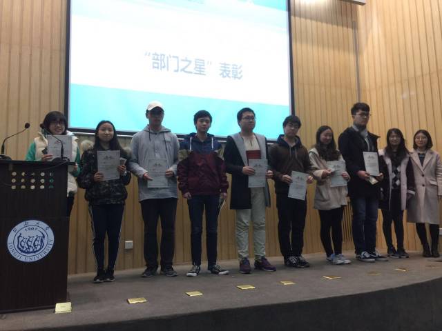 大会第二项议程是对部门之星的表彰,大会播放了各部门部门之星的视频,并由团学联副主席闫卓、陈俪唯为部门之星颁发了奖状以及团学联准备的奖品。