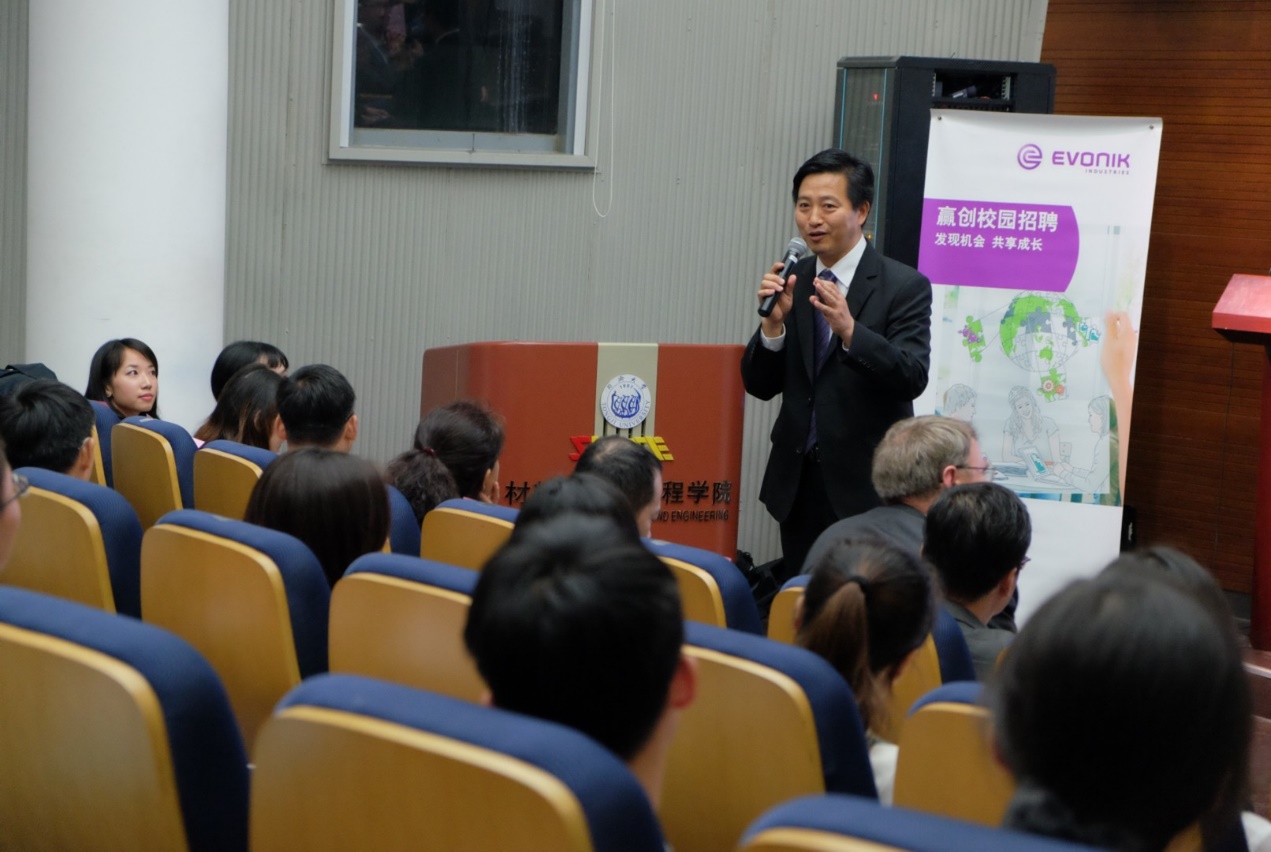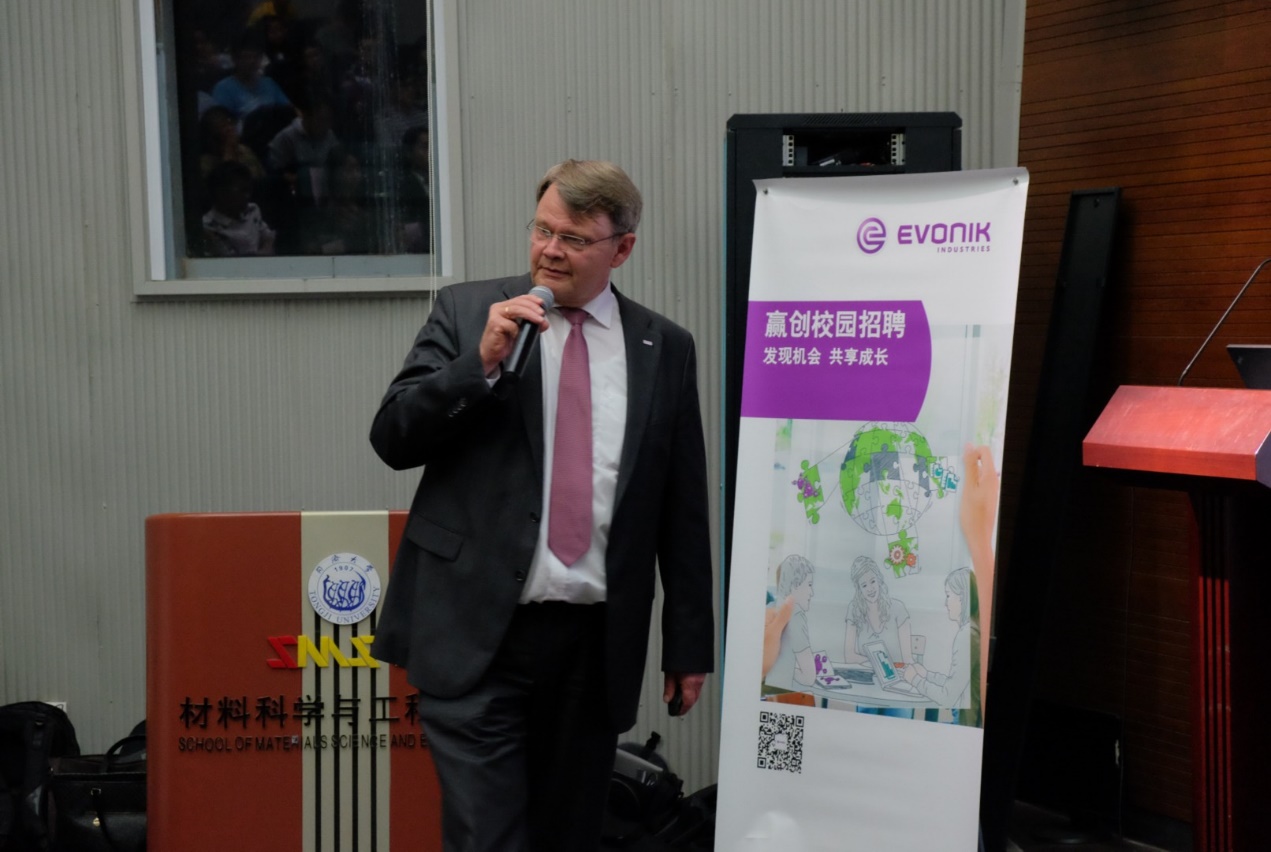 嘉定校区材料学院德才馆顺利举行。赢创大中华区总裁柯乐施(Dr Claas Klasen)博士、赢创特种化学(上海)有限公司总经理陈金秋博士、赢创德固赛(中国)投资有限公司人力资源总监程大年、赢创特种化学(上海)有限公司业务项目经理陆芳(同济校友)等做客宣讲会,学院副院长邱军、党委副书记王凌凌出席。来自同济、交大等高校的各专业的2017届本、硕学生约100人与会。