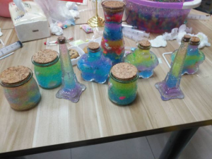 海洋瓶的制作方法简易,只需将事先泡好的海洋宝宝碾碎,通过针筒注入瓶子,再配以贝壳海星等小饰品。但即使是如此简单的制作,大家也充分发挥创意,将普通的空瓶装饰得美轮美奂。