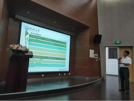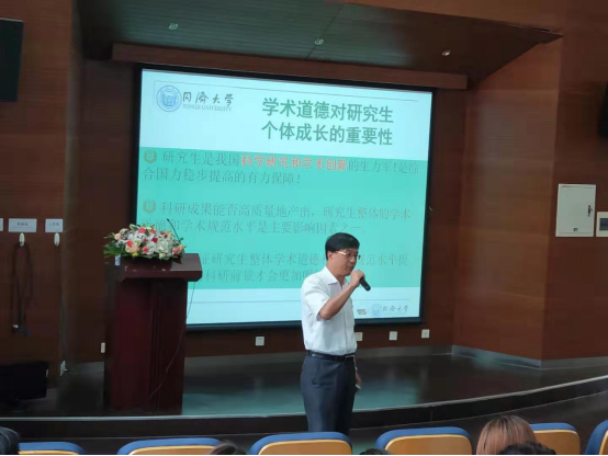 最后,王德平教授向同学们具体讲解了在学术行为和学术活动中我们应遵守的学术道德和学术规范,并通过季建业博士论文抄袭、唐俊学历造假、东京大学加藤茂明教授实验数据造假等学术不端的案例,警醒同学们学术不端的行为会对自己人生带来极大的不良影响。人生的扣子,从一开始就要扣好。王德平教授深情寄语2019级全体新同学:堂堂正正做人、认认真真做事,努力追求学术与学位、为人与为学、科学精神与人文精神三方面和谐统一。