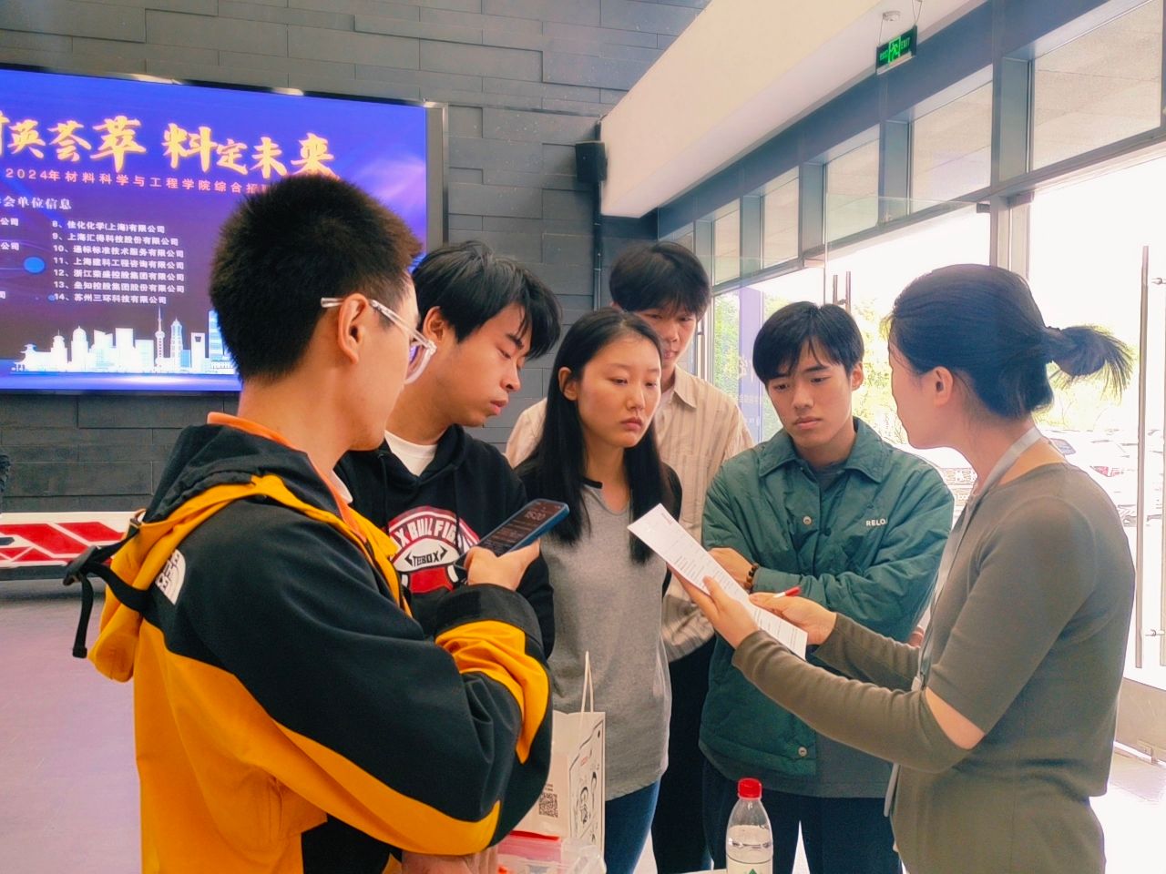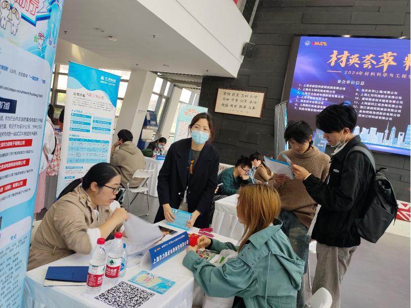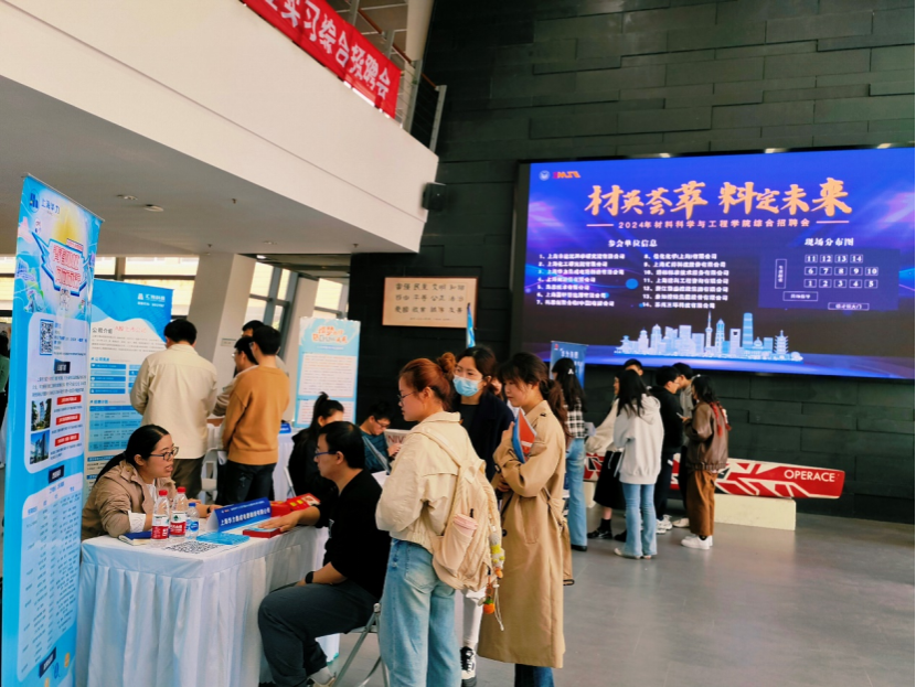 2024年就业实习招聘会在嘉定校区德才馆一楼大厅成功举办。本次招聘会吸引了上海市建筑科学研究院有限公司、上海化工研究院有限公司、上海华力集成电路制造有限公司、上海国轩新能源有限公司、科思创聚合物(中国)有限公司、浙江荣盛控股集团有限公司等16家业内知名用人单位参加,为莘莘学子提供了百余个优质就业与实习岗位,涵盖材料、化工、半导体、能源、通信、咨询等多个领域,现场气氛热烈。
