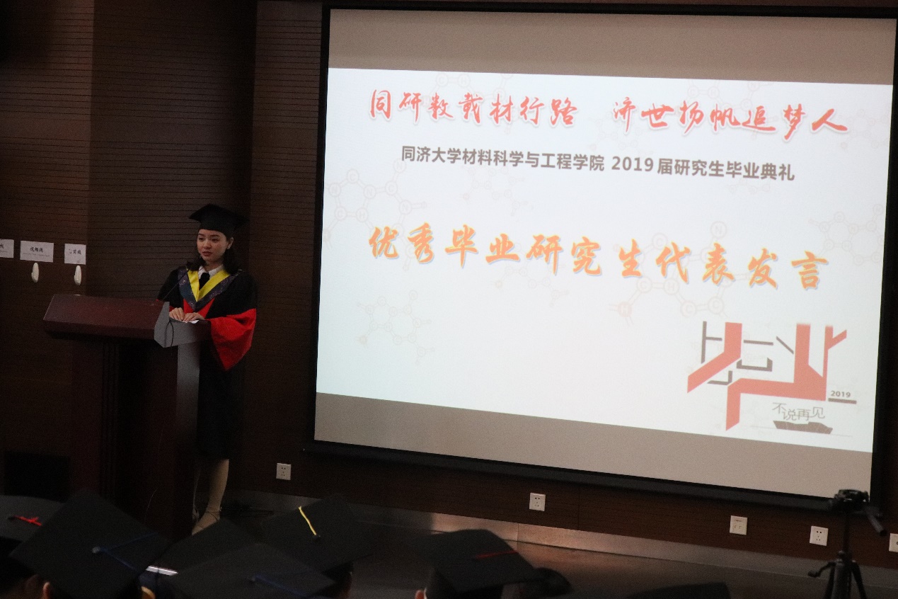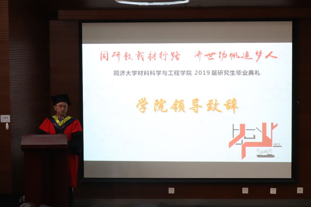 保卫处处长、材料学院教授杨正宏,学院学科委员会主任黄云辉,学院党委副书记袁华、王凌凌,学院副院长姚武,以及学院教师代表、家长代表和2019届125名毕业研究生出席。典礼由王凌凌主持。