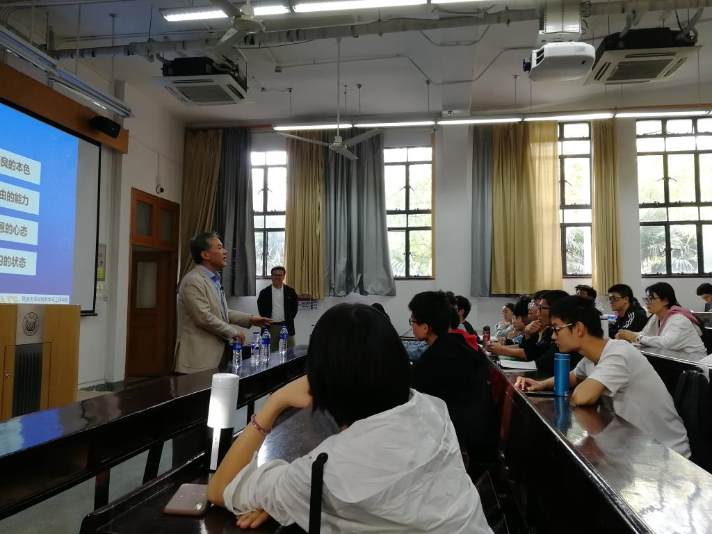 90级材料学院校友、延锋内饰汽车饰件系统有限公司副首席执行官武文光,应学院邀请,在逸夫楼二楼报告厅为大一同学们带来了一场题为“成长引航”的讲座。讲座不仅有着企业家对材料专业的认知,更有着武文光校友对于大学学习以及人生的理解。材料学院副院长邱军教授、材料学院学工办主任、新生院辅导员宋文娟老师与会,报告会由学院党委副书记王凌凌主持。