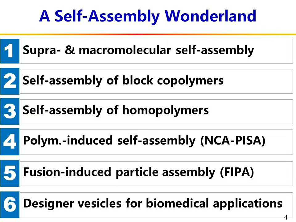 杜教授全程使用流利的英文进行报告,结合其课题组的最新研究成果,深入浅出地带领大家走进了化学自组装的世界。首先从超分子化学讲起,再过渡到超分子自组装及大分子自组装,然后循序渐进,在第二部分介绍了嵌段共聚物自组装,系统地讲述了其理论和方法。第三部分介绍了均聚物自组装,第四部分讲述了领域中广受关注的聚合诱导自组装,并分享了课题组的最新研究成果(NCA-PISA)。第五部分为其最新研究成果:融合诱导粒子自组装。没想到,四臂囊泡诞生的背后,竟然蕴含着道家“刚柔并济”的哲学思想,以及儒家“不偏不倚”的中庸之道,让人感叹中华文化与科学技术美妙结合的神奇力量。最后一部分介绍了高分子囊泡在生物医药领域的应用前景,并详细讲述了“以糖控糖”囊泡的血糖调控机制,超声响应囊泡的抗癌原理,以及双冠囊泡抑制牙周炎的历程。