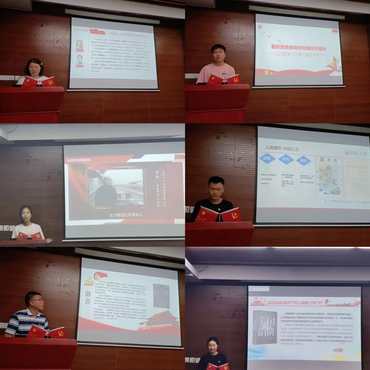 比赛过程中,各位参赛选手以感人的故事、多样的视角出发,讲述他们对于红色基因、百年光辉历程的感悟。孙宇星同志以“永续红船精神,照亮全新征途”为主题,以一艘久经漂泊仍坚守的红船来承载党的建设历程,她指出共产党人用血肉守护的是信仰,传递的是“红船精神”——开天辟地、敢为人先的首创精神,坚定理想、百折不挠的奋斗精神,立党为公、忠诚为民的奉献精神。刘科、倪菲儿、张鑫和岑鑫浩四位同志则从英雄角度出发,分别介绍了为脱贫攻坚、航空报国、捍卫国土、民族觉醒做出卓越贡献的英雄。万千中骨,万千热血,他们以实例号召广大青年朋友们向前辈英雄致敬,肩负起90后的担当和使命。张雪霞以“学党史,守初心”为主题,从信仰之光、红色基因、英雄史诗、人民情怀和伟大复兴五个板块介绍了中国共产党的成长足迹与发展历程。