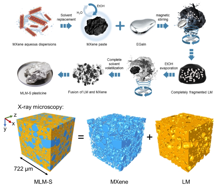 该论文利用流体和液态金属的变形特性,成功将MXene以连续相的状态引入镓基液态金属中来制造可延展的MLM复合材料。该方法无需化学修饰和后处理,显著提高了填料分散的均匀性和稳定性,随之产生1+1>2的效果。