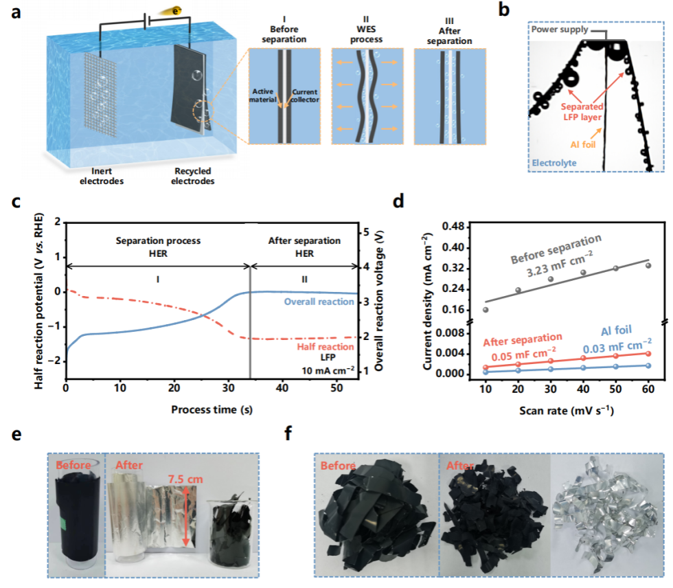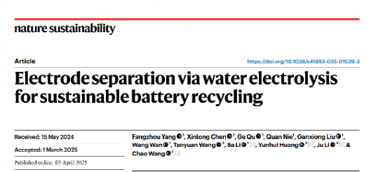 王超特聘研究员团队的最新文章“Electrode separation via water electrolysis for sustainable battery recycling”,为利用电解水产气实现锂离子电池高效回收提供了新的路径和可能性。