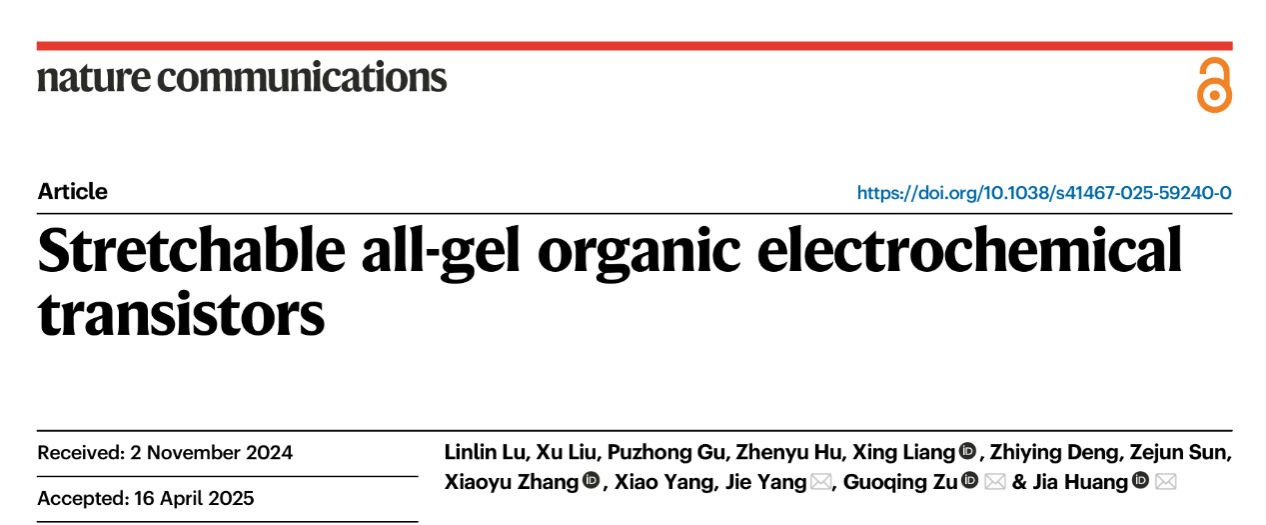 黄佳教授团队研发了高可拉伸、高跨导有机电化学晶体管(OECT),并联合中国科学院上海技术物理研究所研发仿生中红外神经形态晶体管,系统探索了其化学感知、类触觉和类视觉的感知性能。以上两项工作均发表在《自然·通讯》(Nature Communications)上。