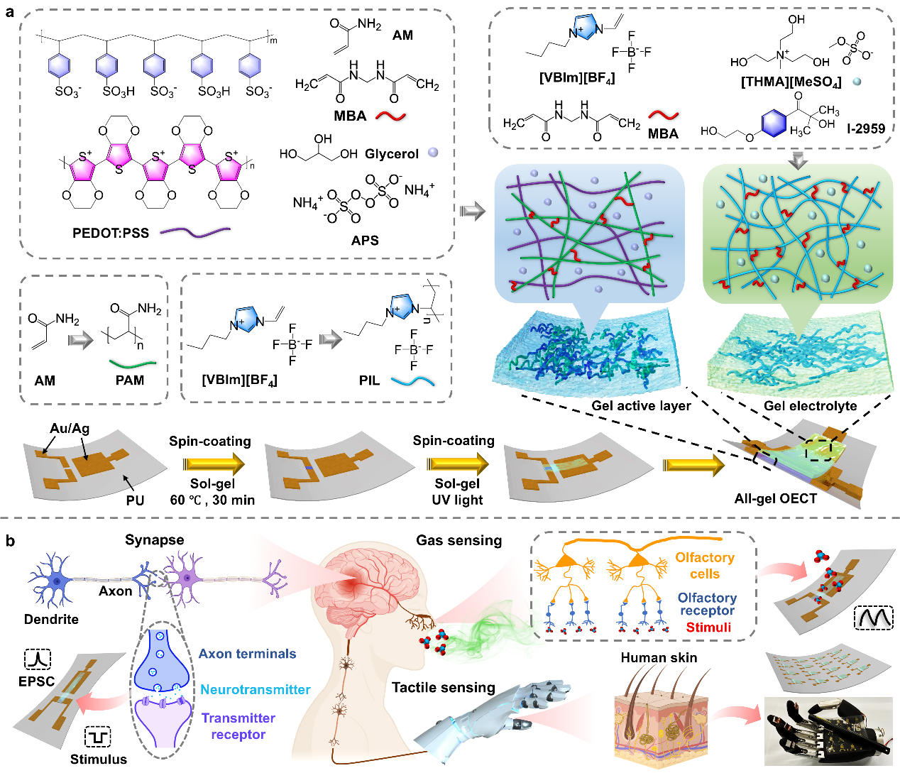 鉴于此,黄佳教授团队开发了高可拉伸全凝胶OECTs,通过构建一体化凝胶网络结构,突破了传统器件中离子渗透/传输效率与机械性能难以协同提升的技术瓶颈,赋予器件优异的综合性能。全凝胶OECT展现出高跨导(86.4 mS)、高开关比(105),同时具备50%的拉伸形变能力,并在1万次拉伸循环测试中保持稳定工作。研究团队成功构筑了基于全凝胶OECT的可拉伸人工突触器件、高灵敏度电子皮肤以及气体传感器,有望应用于机器人的触觉感知、类生物嗅觉传感。本工作为发展新一代高性能柔性电子器件提供了一种普适性的全凝胶策略,有望推动智能可穿戴设备、软体机器人和生物电子接口等领域的发展。