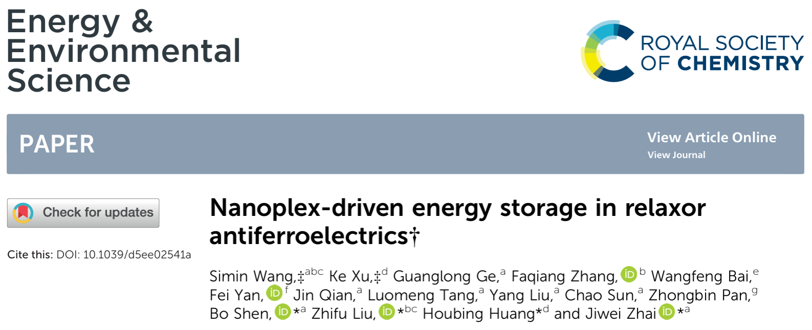 该研究成果以“Nanoplex-driven energy storage in relaxor antiferroelectrics”为题发表于《能源与环境科学》(Energy & Environmental Science)》上。论文的第一单位是色情视频