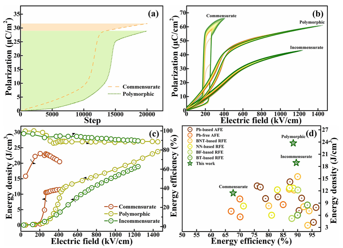 介电陶瓷电容器作为电子设备的核心元件之一,因其超高的功率密度、毫秒级的充放电速度及卓越的可靠性,在消费电子、新能源并网、脉冲功率装备及医疗设备(如除颤器)等领域展现出巨大潜力。然而,传统反铁电陶瓷材料(如锆酸铅,PbZrO3)虽经多年研究,其固有的调制结构(如CM和ICM)仍制约着储能密度与效率的进一步提升,亟需开发新型调控机制。同时,NaNbO3是无铅反铁电材料的重要成员,其弛豫反铁电R相结构显示出独特的储能优势。但是其反铁电相变的大滞后和反平行极化证据的缺乏阻碍了能量存储性能。