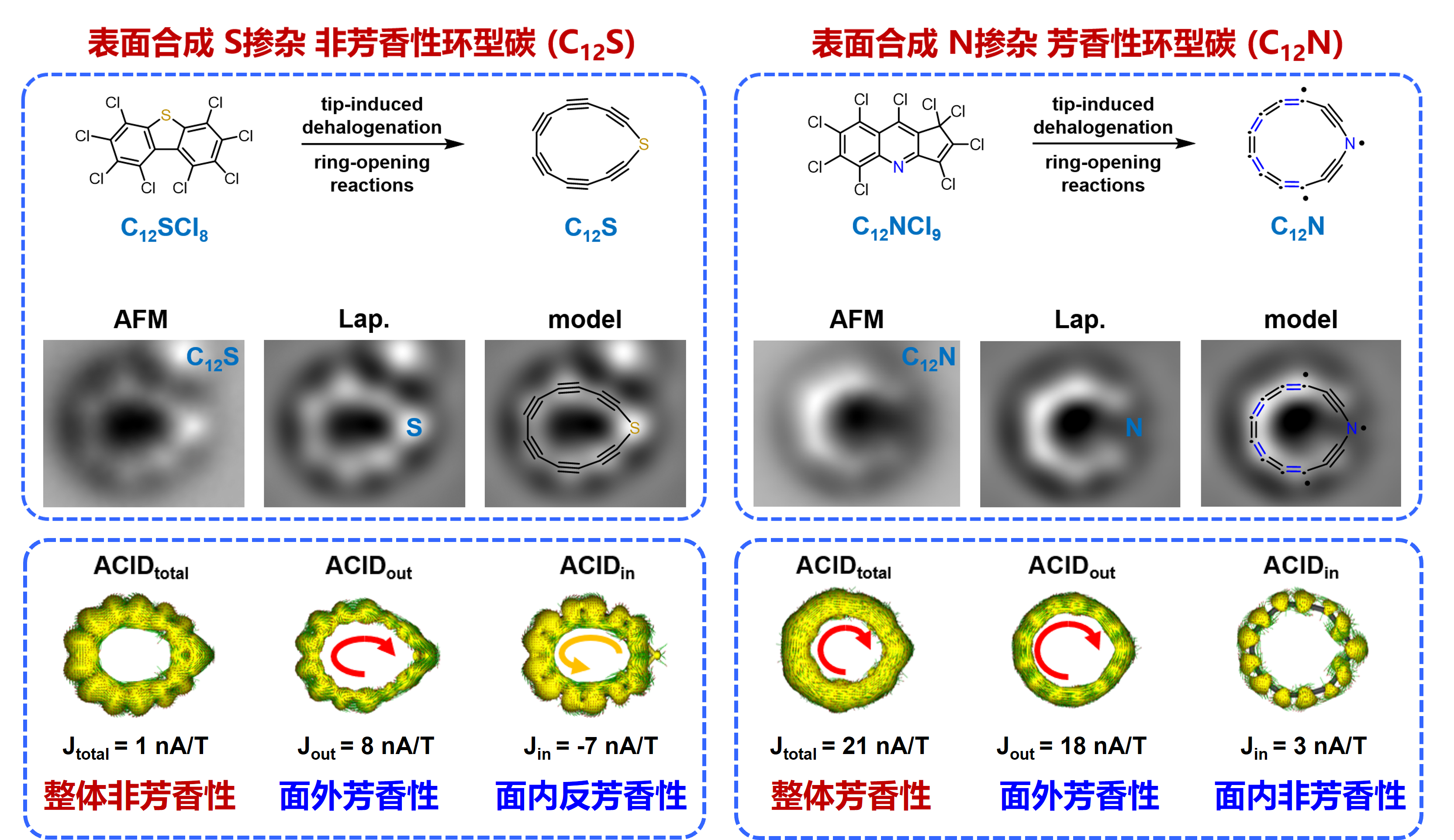 许维教授团队提出了一个大胆的思路:“如果在环型碳里加入一个‘外来原子’,比如硫或氮,会不会打破这种双重特性,让芳香性变得可以调节?”他们设计了两种含有硫或氮的全卤代前体分子,然后利用扫描探针显微镜的针尖操纵技术,在超低温表面上一步步去除卤素原子并诱导前体分子发生反伯格曼开环反应,最终合成了单个硫和氮原子掺杂的环型碳:C12S与C12N。