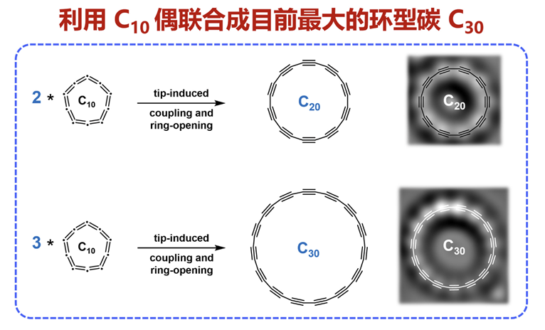 为解决这一难题,许维教授团队提出了“偶联–开环”新范式:利用小尺寸环型碳作为基础单元,通过针尖操纵诱导其发生偶联与开环反应,从而实现更大尺寸环型碳的构筑。研究团队选用已成熟制备的 C10 作为起始前体(Nature 2023, 623, 972),首先在绝缘衬底表面制备多个 C10 分子,随后通过针尖操纵促使其偶联生成 C10 二聚体或三聚体,并在后续开环步骤中精准转化为 C20 和 C30。