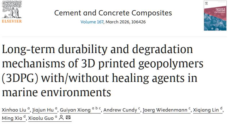 郭晓潞教授团队研究成果以“Long-term durability and degradation mechanisms of 3D printed geopolymers (3DPG) with/without healing agents in marine environments”为题在线发表于Cement & Concrete Composites。