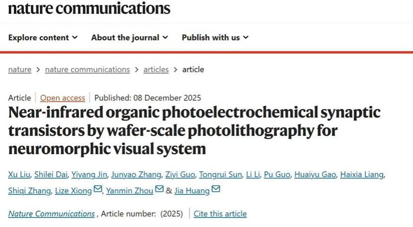 黄佳教授团队在有机晶体管感知器件领域取得进展。12月8日,《自然•通讯》(Nature Communications)在线发表了该团队的一篇研究论文,题为“Near-infrared organic photoelectrochemical synaptic transistors by wafer-scale photolithography for neuromorphic visual system”。