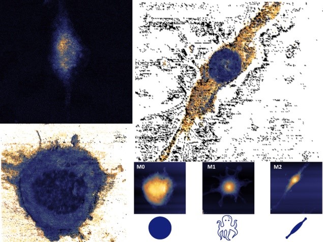 本作品利用基于扫描探针平台的纳米光热显微术和纳米力学显微术针对吞噬细胞两种不同的亚型(M0&M2)下的细胞内结构(形貌);弹性力学(杨氏模量)和化学成分(蛋白质)分布进行了表征研究。弹性模量成像清晰显示出M0和M2细胞内部的亚表面结构即类“蛋黄”结构(细胞核),其具有较小的弹性模量(暗蓝色)。随后利用纳米光热显微术针对M2细胞的内部化学成分进行了表征研究,发现其在1544cm-1附近存在独特的光热吸收,对应于蛋白质种的酰胺键,表面细胞内具有大量的蛋白,发现M2细胞两端“足部”与“蛋黄”结构种的化学成分存在显著差异。随后在1544cm-1波数下进行细胞的光热吸收成像。发现“蛋黄”结构中存在密集的蛋白分布,细胞“足部”足部蛋白含量较少,这与弹性力学成像结果相对应。该表征手段可以实现细胞亚表面结构的辨别以及细胞内纳米尺度化学成分的分辨与成像。