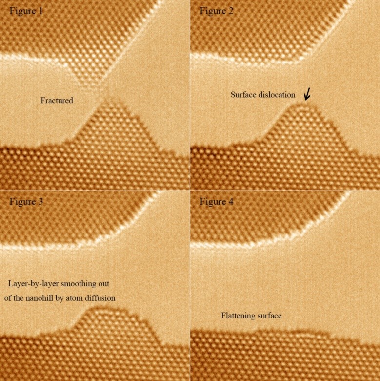 本视频捕捉到室温下金纳米线断裂后,“小山”状晶体表面在崩塌过程中的原子形态瞬时转变,发现该过程是在表面应力的毛细作用驱动下,由台阶边缘上的表面原子逐层扩散引起的,并据此在原子尺度上估计了断裂纳米线的表面自扩散系数。通过对金纳米线断裂端表面原子扩散的实验观察,我们揭示了纳米线断裂时的类液态行为,对金属纳米结构材料的稳定可靠性研究具有重要意义。