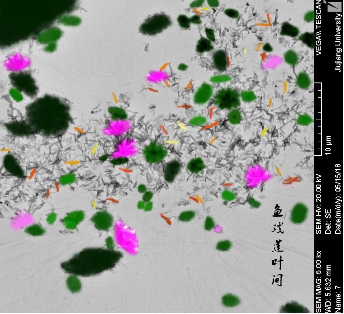 本幅作品将原SEM图经过Photoshop反相、着色等处理使其呈现出夏夜莲池的画面。粉体团聚程度较大的地方着色为莲叶和莲花,比较分散的氧化钇晶体则视为莲池中的戏游的鱼儿,少数着色为黄色、金黄色或橙黄色,大部分保留为灰黑色。“江南可采莲,莲叶何田田。”江南又到了适宜采莲的季节了,莲叶浮出水面,挨挨挤挤,重重叠叠,迎风招展。在劲秀挺拔的莲叶下面,欢快的鱼儿在不停的嬉戏玩耍。一会儿在这儿,一会儿又忽然游到了那儿。看着成群的鱼儿倏忽往来,潜沉浮跃,似乎自己也同鱼一样,轻松活泼,无挂无碍。每当现实社会的种种压力让我们疲惫不堪,不妨来读读这首诗、看看这幅画吧,想象一下像千年前的诗人一样站在莲池边,夏日的清新迎面而来,心情是不是也随之而清爽轻松起来了呢?愿我们时光清浅,岁月如莲!
