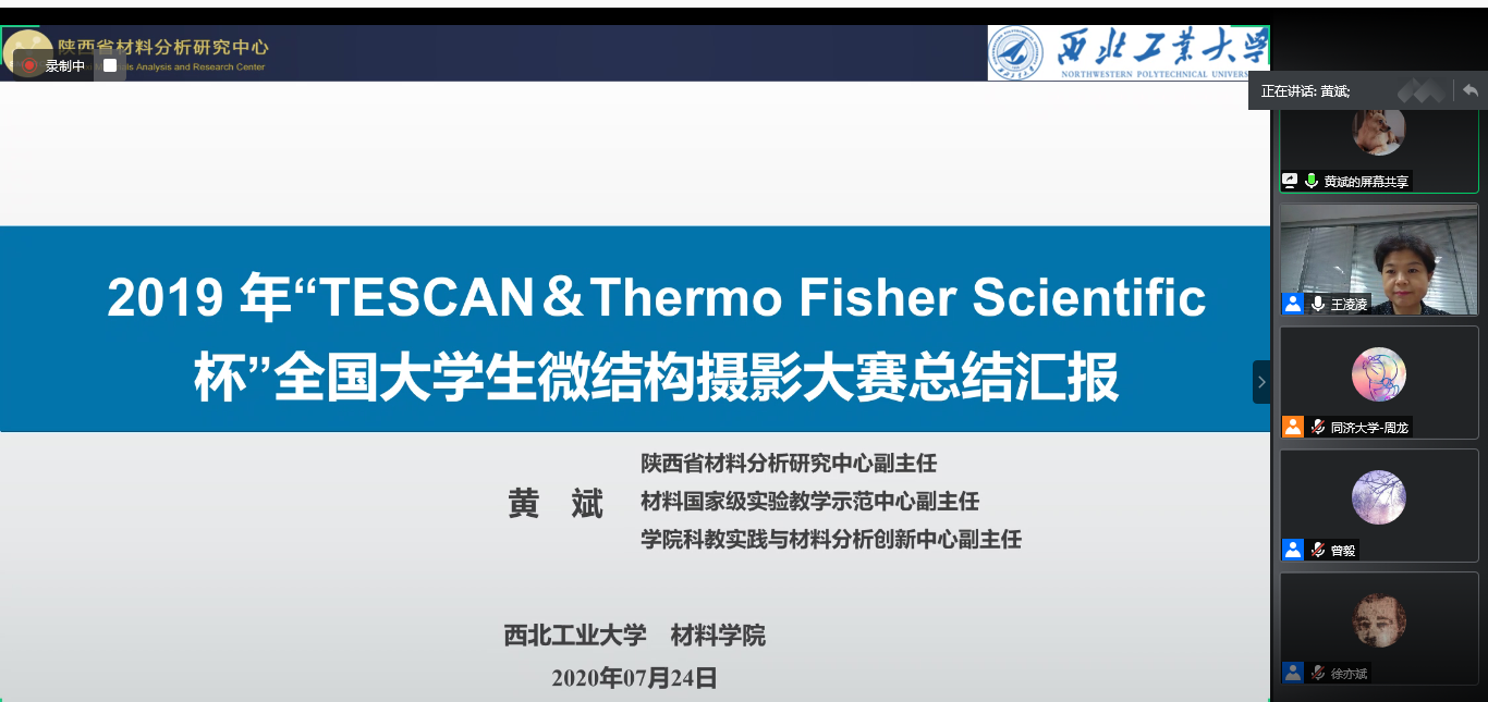 陕西省材料分析研究中心副主任、西北工业大学材料学院黄斌老师代表2019年全国大学生微结构摄影大赛承办单位西北工业大学,对2019年大赛做了详实的总结报告,从大赛概况、本届特色以及经验与问题三个维度进行了介绍。从大事时间表开始回顾了作品的提交情况、最后的决赛评审及获奖情况。罗列了去年大赛的若干特色,例如大赛参赛作品的数量以及最终入围决赛作品的数量均有所增加、赛前举办的学术论坛、大赛评委构成及评分细则均加以优化。重点分享了办赛经验与存在的问题,并建议加大宣传力度,特别是对比赛规则的宣传和解读,在线投稿系统以及记分评分规则的完善,征稿范围可拓宽至生物、化学等学科领域。黄老师的阐述引起了各位老师的共鸣,也令接下来的承办单位获益匪浅。