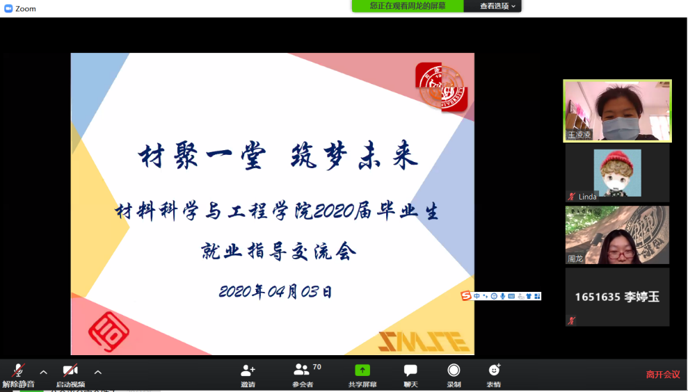 为积极应对疫情形势下毕业生就业工作面临的全新挑战,色情视频 2020年4月3日(周五)11:45于线上Zoom平台会议室召开了“材聚一堂,济梦未来——2020届毕业生就业指导交流会”。本次会议由色情视频 党委副书记王凌凌老师、学工办周龙老师和李楠老师共同参与,并邀请到2017届温州选调生洪万领校友、2020届毕业研究生奚悦静同学作为特邀毕业生代表做了交流发言。本次会议旨在响应疫情期间国家就业政策、学...