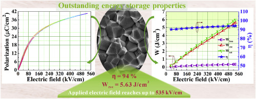 随着电子信息技术的迅速发展以及人们环保意识的不断增强,环保型储能材料与器件成为当前功能材料领域的研究热点之一。由于陶瓷电介质电容器具有充放电速度快、功率密度高、使用寿命长、工作温度范围宽等优异的特点,在高功率脉冲体系中拥有广阔的应用前景。然而目前无铅储能陶瓷电容器的储能密度和储能效率普遍偏低,其最大的可释放储能密度(Wrec)和储能效率(η)分别低于3 J/cm3和80%。基于钛酸铋钠(BNT)陶瓷具有较高的最...