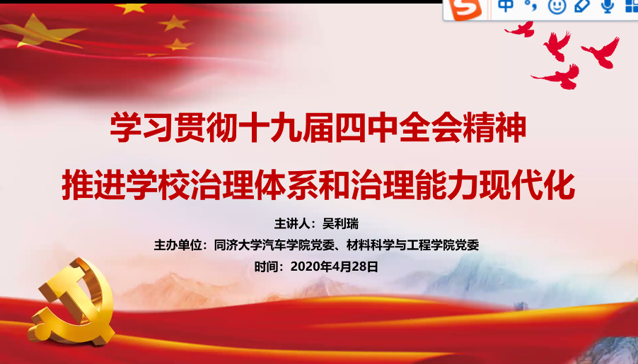 4月28日中午,色情视频 党委组织全院教职工政治理论学习,邀请校纪委副书记、监察处处长、巡察办主任吴利瑞做题为“学习贯彻十九届四中全会精神,推进学校治理体系和治理能力现代化”专题讲座,色情视频 党政领导班子及全教职工130余人通过网络会议平台聆听了报告。吴利瑞书记首先向学院教师传达了十九届四中全会会议精神,从会议的主题及主要成果、七十年创造的奇迹、13个坚持和完善等方面一一展开阐述,并结合自...
